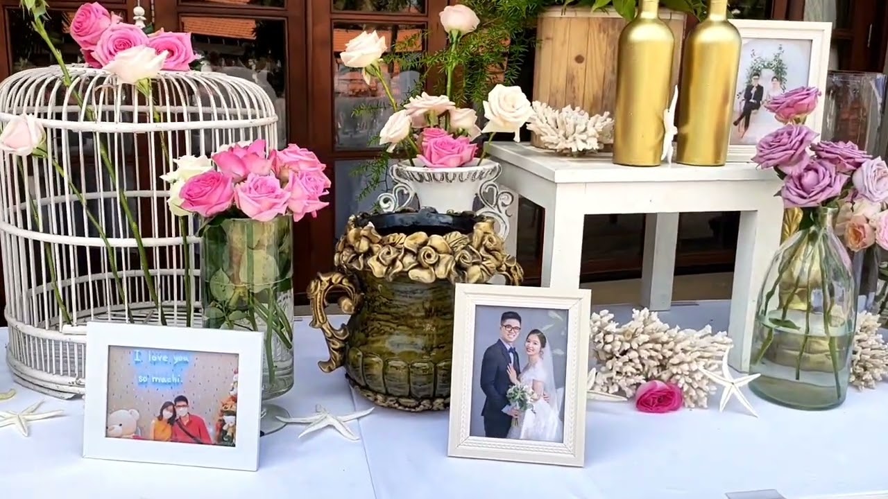 ✨Contemporary fresh flower decoration for wedding arch and aisle, decorative welcome table area with table, guest book and welcome signboard, and Bridal hand bouquet and Groom boutonniere